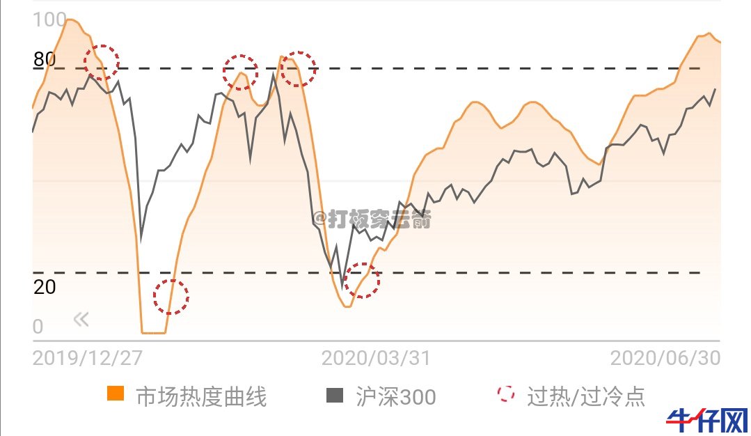 此外,另一個重要的指標,短線氛圍和市場情緒必須關注的市場熱度曲線,早已進入了80的過熱區,6月24日達到近期熱度的一個高點93度,今天再上證指數大漲的情況下,熱度值是90度,略有回落!前期我們也講過,當市場熱度曲線發生異常一定要警惕:當市場熱度曲線進入80之上,在回落向下跌破80的時候,則要關注這種異常,大盤或又反轉的可能!