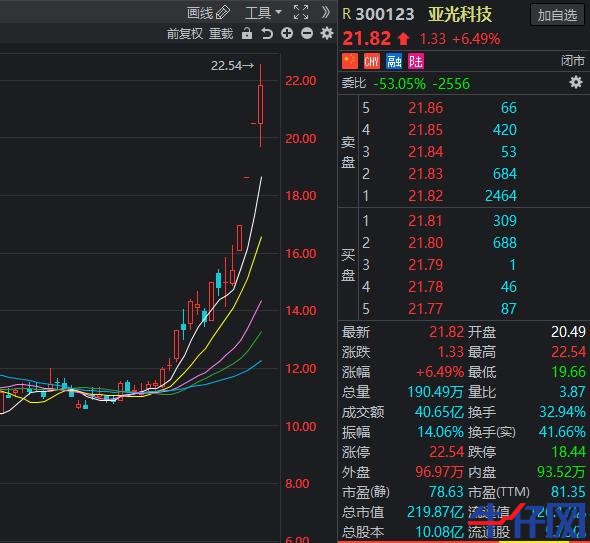 其中,亞光科技(行情300123,診股)周三一度漲停,收盤漲6.49%,近一個月以來,公司股價已翻倍。龍虎榜數據顯示,深股通攜手頂級游資、一線游資暴買3.18億元(凈額),三機構狂拋2.11億元。