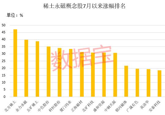 在價格持續上漲的刺激下,A股與稀土相關的稀土永磁板塊近期表現較為活躍,7月以來稀土永磁指數累計漲幅超過20%。北方稀土(行情600111,診股)、金力永磁(行情300748,診股)、五礦稀土(行情000831,診股)、中色股份(行情000758,診股)、科恒股份(行情300340,診股)等10股累計漲幅在30%以上。