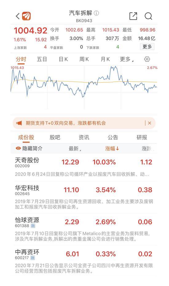 8月13日,汽車拆解概念股集體異動,天奇股份(行情002009,診股)(維權)(002009)漲停,報收12.29元/股,華宏科技(行情002645,診股)、怡球資源(行情601388,診股)(維權)(601388)等跟漲。