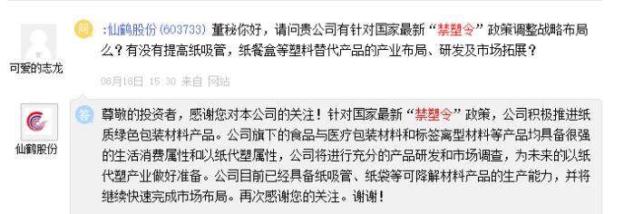 仙鶴股份(行情603733,診股)則表示,針對國家最新“禁塑令”,公司正積極推進(jìn)紙質(zhì)綠色包裝材料產(chǎn)品。
