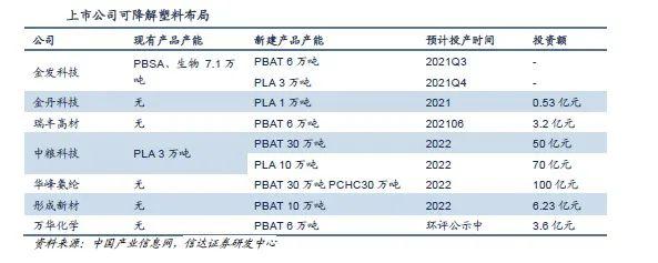 據(jù)華安證券統(tǒng)計,目前已有36家公司有在建或擬建的可降解塑料項目,新增產(chǎn)能合計440.5 萬噸,是現(xiàn)有產(chǎn)能的7倍。以下表格是部分上市公司對可降解塑料產(chǎn)能的布局情況: