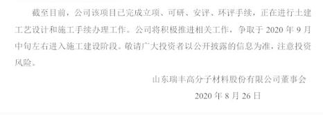 8月25日晚間,瑞豐高材(行情300243,診股)公告,8月24日,公司收到淄博市生態(tài)環(huán)境局出具的審批意見,同意年產(chǎn)6萬噸生物可降解高分子材料PBAT項目,按申報工藝、規(guī)模、地點和污染防治措施等進(jìn)行建設(shè)。瑞豐高材表示,公司將積極推進(jìn)相關(guān)工作,爭取于2020年9月中旬左右進(jìn)入施工建設(shè)階段。