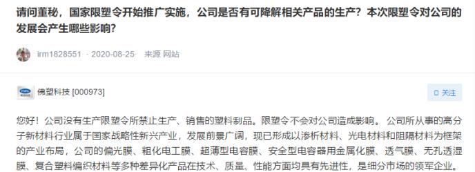 佛塑科技(行情000973,診股)也回復(fù)投資者稱,公司沒有生產(chǎn)限塑令所禁止生產(chǎn)、銷售的塑料制品。限塑令不會對公司造成影響。
