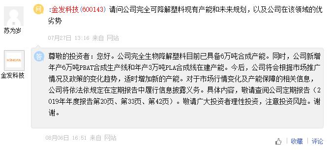 除金發(fā)科技、瑞豐高材外,彤程新材(行情603650,診股)、道恩股份(行情002838,診股)、金丹科技(行情300829,診股)、萬華化學(xué)(行情600309,診股)等上市公司也在布局相關(guān)產(chǎn)能。與此同時,面對投資者的提問,不少上市公司在互動平臺回復(fù),公司不涉及“禁塑令”相關(guān)業(yè)務(wù)。