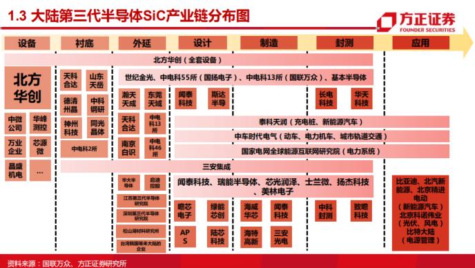 目前,國內(nèi)碳化硅產(chǎn)業(yè)內(nèi)主要集中于4寸、6寸碳化硅襯底生產(chǎn),8寸襯底已有樣品出貨。根據(jù)陳杭上述報告整理,與傳統(tǒng)半導體類似,碳化硅產(chǎn)業(yè)鏈同樣分為設備、襯底、外延、設計、制造、封測、應用7個部分,國內(nèi)相關公司在產(chǎn)業(yè)鏈各段布局如下圖所示:
