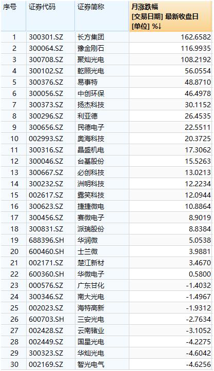 若將時間線拉長,本月初至今,第三代半導體相關概念股股價整體呈上漲趨勢,其中長方集團(行情300301,診股)、豫金剛石(行情300064,診股)、聚燦光電均漲超一倍。