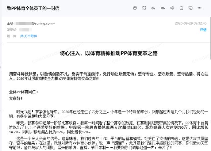 “在賽制排期密集的情況下,PP體育平臺跑出了比上個賽季更好的數據。”從PP體育總裁王冬致全體員工的一封內部信中可以看出,其對這份運營成績的認可,并直言這是大家共同堅守、奮斗的結果,“尤其是駐扎中超前線的同事,近80天堅守前線,舍棄與家人的團聚,緊張的采訪、直播、節目錄制……我要向你們誠摯的道一聲:辛苦了?!?/P>