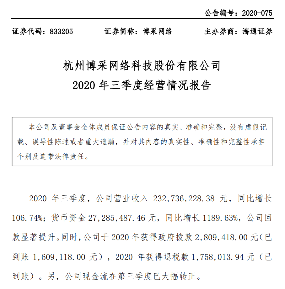 “十一”長假結(jié)束后第一個(gè)交易日,博采網(wǎng)絡(luò)率先發(fā)布了2020年三季度經(jīng)營情況報(bào)告。