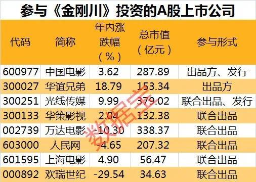 從《金剛川》的出品發行方可以看出,有多家行業內公司聯合參與,陣容豪華。證券時報·數據寶梳理發現,A股上市公司中,出品方有中國電影(行情600977,診股)、華誼兄弟(行情300027,診股),聯合出品的有光線傳媒(行情300251,診股)、華策影視(行情300133,診股)、萬達電影(行情002739,診股)和人民網(行情603000,診股)等。