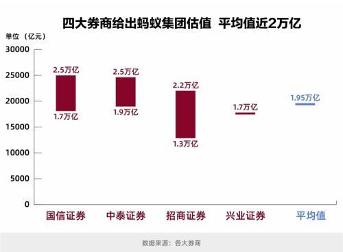 多家券商對其進行了估值測算;其中4家券商平均值為1.95萬億;螞蟻集團有望沖擊貴州茅臺(行情600519,診股)總市值第一的寶座。