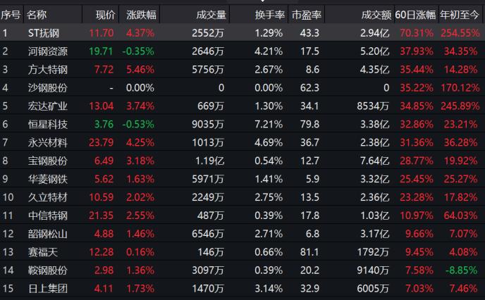 Wind數據顯示,11月以來,鋼鐵指數(886012)月內漲幅達到15.45%。其中,ST撫鋼(行情600399,診股)、河鋼資源(行情000923,診股)、方大特鋼(行情600507,診股)、沙鋼股份(行情002075,診股)等7家鋼鐵類上市公司近60日漲幅超過30%。
