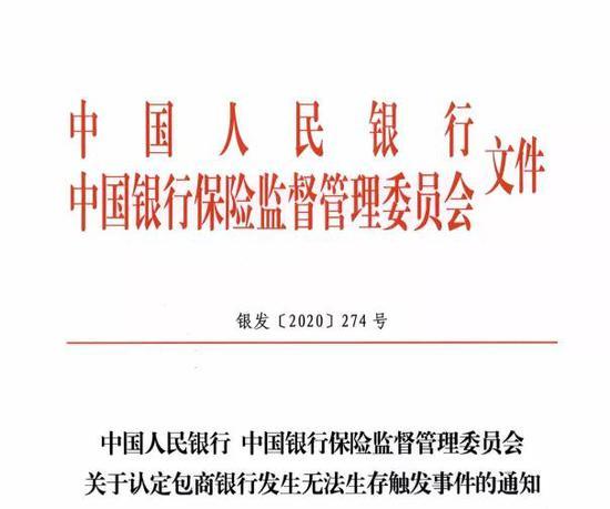 根據該《通知》,2019年5月24日,中國人民銀行、中國銀保監會對包商銀行實施接管。《通知》稱,在接管期間,經清產核資,確認包商銀行已嚴重資不抵債,無法生存。根據《商業銀行資本管理辦法(試行)》等規定,中國人民銀行和中國銀保監會認定包商銀行發生“無法生存觸發事件”。