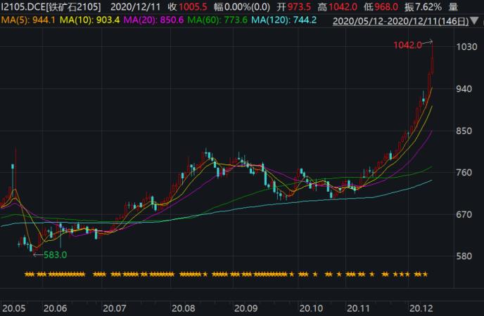 自11月中旬以來,國內鐵礦石期貨價格一路飆升,12月11日上午,鐵礦石主力合約擊穿千元關口,最高漲至1042元,一個月漲近40%。