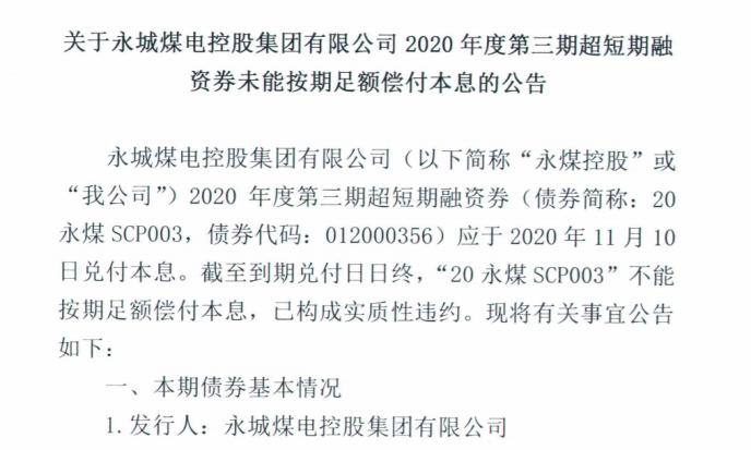 在2020年收官階段,AAA級地方國企永煤控股意外炸雷引爆債券市場。11月10日,永城煤電控股集團有限公司(永煤控股)公告稱,因流動資金緊張,“20永煤SCP003”未能按期足額償付本息,構成實質性違約。