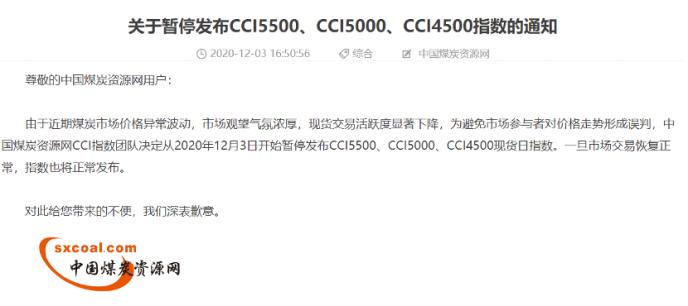 據中國煤炭資源網,由于近期煤炭市場價格異常波動,為避免市場參與者對價格走勢形成誤判,從12月3日起開始暫停發布CCI5500、CCI5000、CCI4500現貨日指數。
