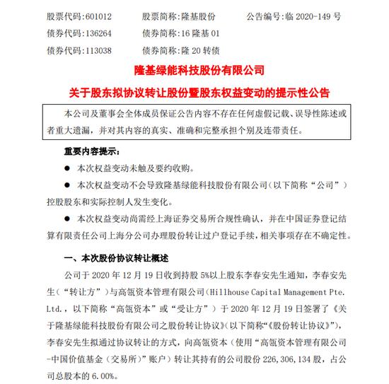 12月20日晚間,隆基股份(行情601012,診股)公告稱,公司股東李春安與高瓴資本于12月19日簽署了《股份轉(zhuǎn)讓協(xié)議》,李春安擬通過協(xié)議轉(zhuǎn)讓的方式,向高瓴資本轉(zhuǎn)讓其持有的公司股份2.26億股,占公司總股本的6.00%;本次交易對價總額為158.4億元。