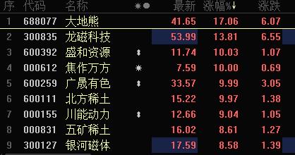 金融界網1月18日消息 今日早盤,稀土永磁板塊高開高走,截至發(fā)稿,盛和資源(行情600392,診股)、焦作萬方(行情000612,診股)、廣晟有色(行情600259,診股)、北方稀土(行情600111,診股)漲停,大地熊(行情688077,診股)、龍磁科技(行情300835,診股)漲超10%,川能動力(行情000155,診股)觸及漲停。