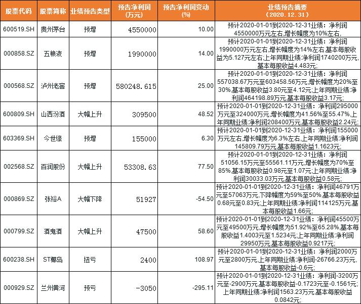 1月11日,瀘州老窖(000568)也發(fā)布業(yè)績預(yù)告,預(yù)計(jì)其2020年歸屬于上市公司股東的凈利潤在55.7億元至60.3億元之間,同比增長20%-30%。貴州茅臺預(yù)計(jì)實(shí)現(xiàn)歸屬于上市公司股東的凈利潤455億元左右,同比增長10%左右。五糧液預(yù)計(jì)實(shí)現(xiàn)歸母凈利潤199億元左右,同比增長14%左右。